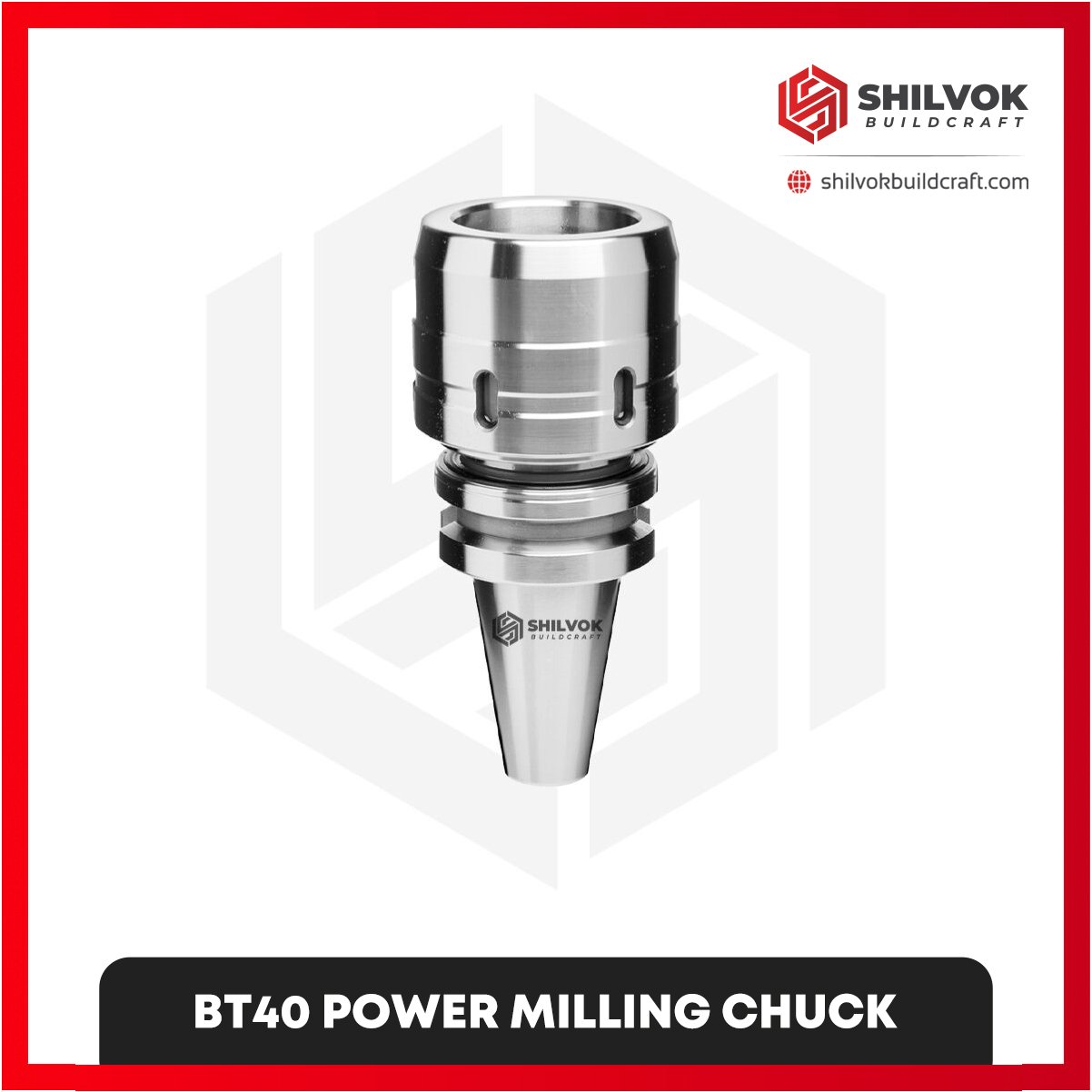 Shilvok Buildcraft BT40 Power Milling Chuck delivers enhanced clamping stability and precision for medium-to-heavy milling operations. Its rigid design reduces vibration and ensures consistent cutting performance. This chuck supports efficient tool use and operational reliability in various milling tasks.