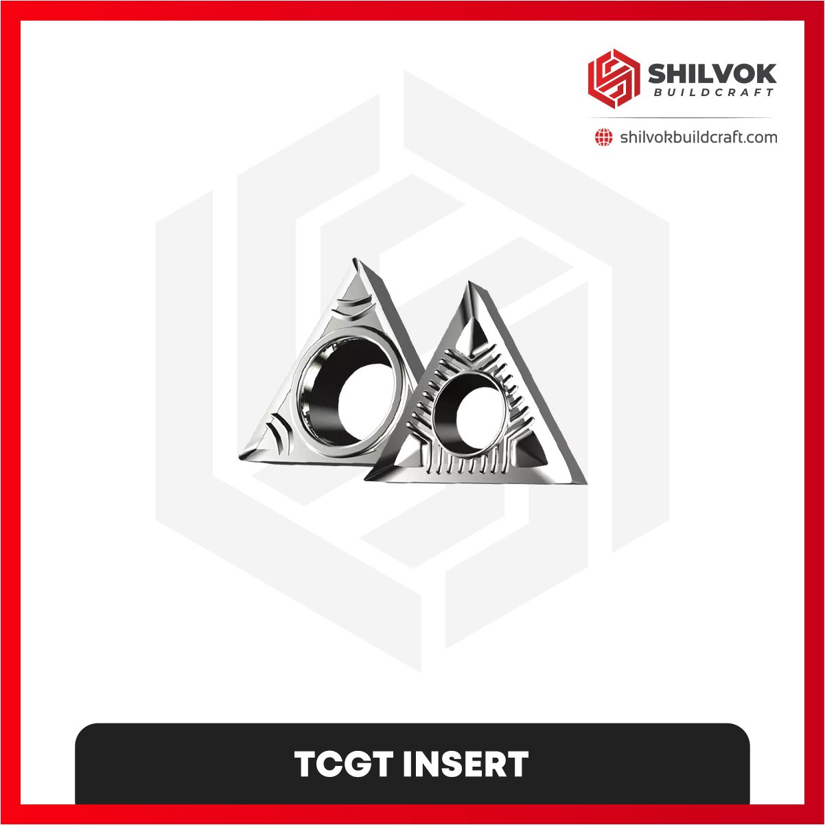 TCGT inserts from Shilvok Buildcraft provide high precision for finishing and medium turning operations. Their triangular negative geometry and optimized chipbreakers reduce cutting forces and vibration, delivering consistent surface finish and edge stability. Suitable for steel, stainless steel, and cast iron, these inserts ensure reliable performance in continuous or interrupted operations.